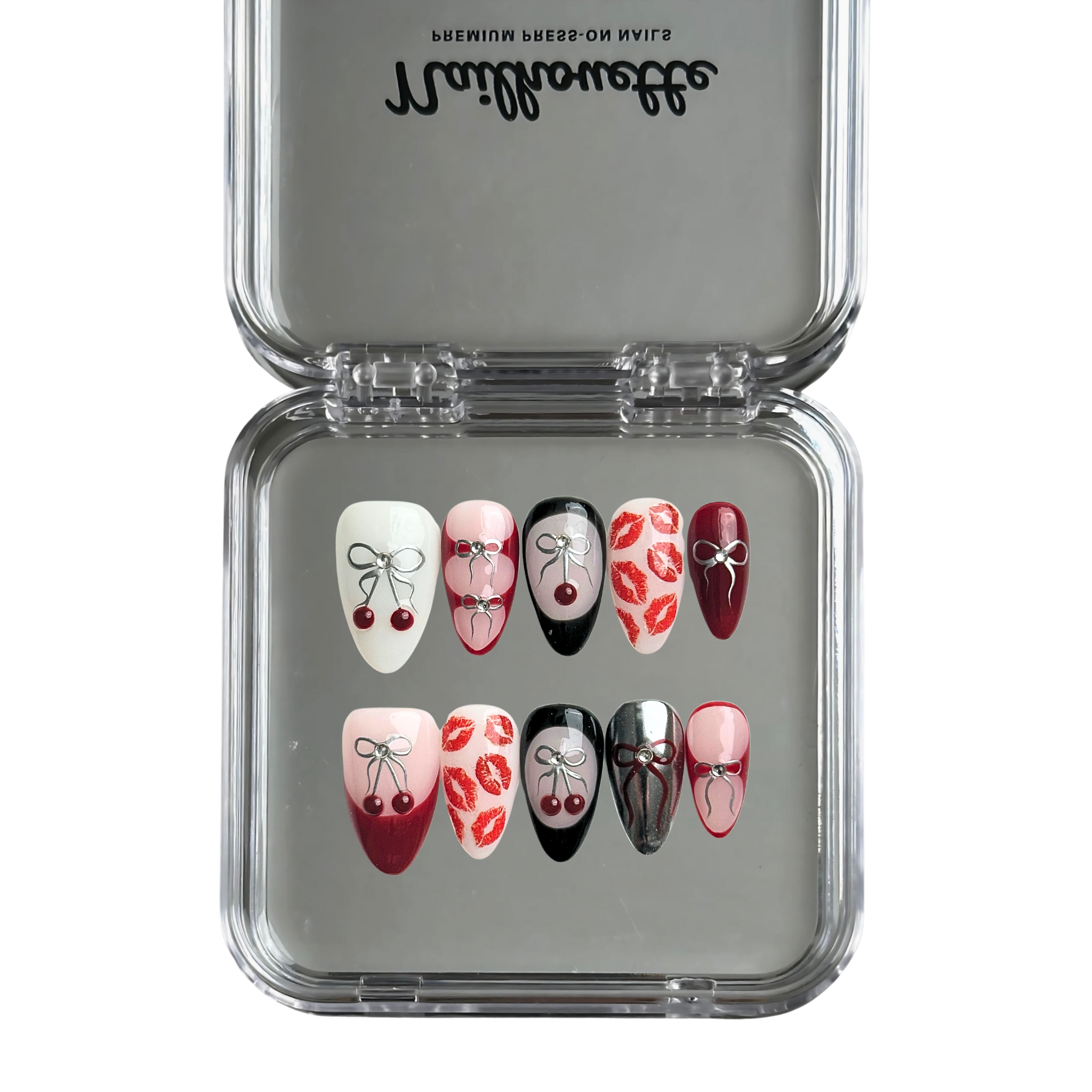 Forge a pact with pure allure with CRIMSON COVENANT, a daringly seductive design from our Blushing Burgundy Collection. These press-on nails are a commanding symphony of passion and edge, featuring a captivating interplay of nude, lustrous silver, and deep crimson red bases. The bold black, red, and silver theme is further intensified by intricate 3D silver ribbon gel paint, playful yet provocative 3D gel-painted cherries, and a tantalizing red lips pattern. CRIMSON COVENANT is an unapologetic celebration of bold, confident femininity.