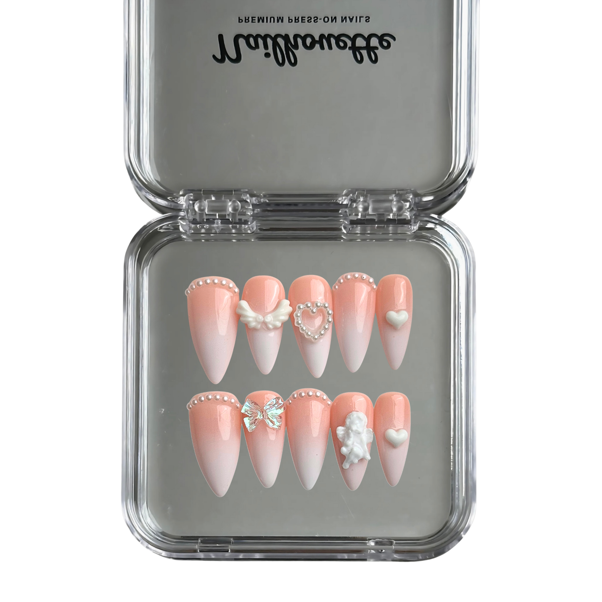 Step into a dreamscape of celestial romance with AMOUR CÉLESTE, an exquisitely divine design from our Blushing Burgundy Collection. These press-on nails are a tender symphony of heavenly artistry, featuring a soft ombre base that gracefully transitions from pure white to a delicate blush pink. Adorned with an array of ethereal 3D elements – including pristine white hearts, lustrous pearl charms, cherubic white cupid figures, majestic angel wings, and elegant transparent ribbon charms – AMOUR CÉLESTE is the epitome of angelic beauty and luxurious femininity.