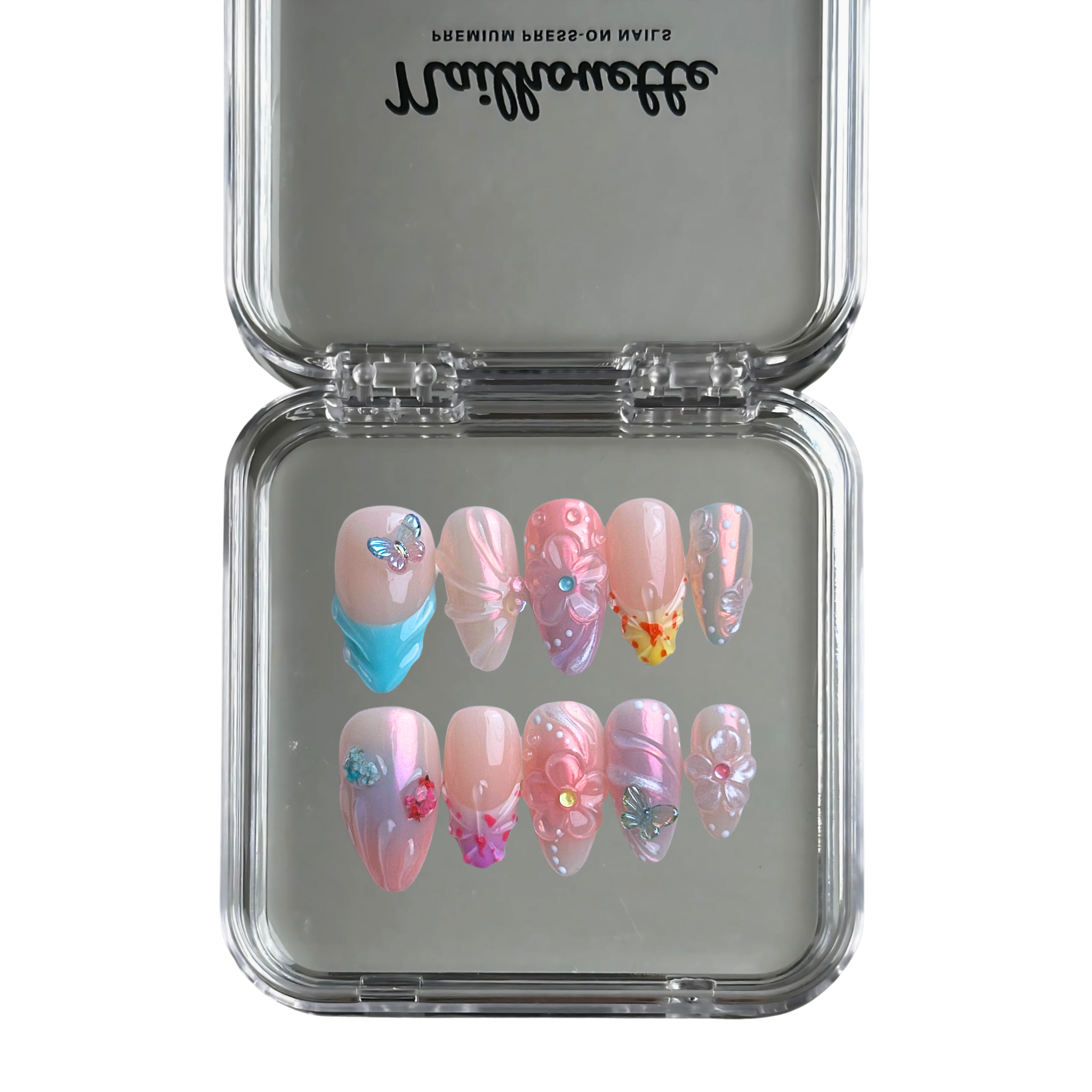 Awaken your inner deity with FLORAL GODDESS, the signature masterpiece of our enchanting FLORAVISION Collection. Each of these ten press-on nails is a unique canvas of botanical artistry, meticulously designed to celebrate the multifaceted beauty of a blooming paradise. The design unfolds upon a sophisticated nude base, blossoming with ethereal ombre transitions of delicate pink, mystical purple, and sun-kissed peachy hues. Intricate, hand-sculpted 3D gel petals emerge with lifelike grace, complemented by charming 3D butterfly accents that seem ready to take flight. Subtle, elegant swirl textures add depth and movement, while unexpected touches of baby blue and soft apricot French tips provide a modern, whimsical flourish.