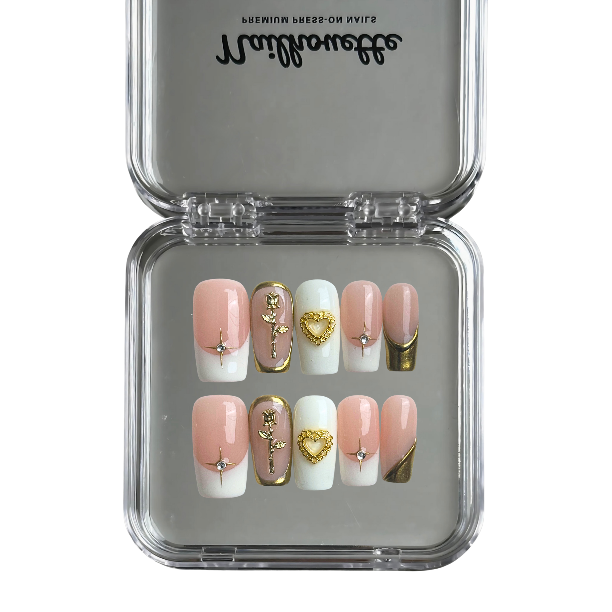 Exude radiant sophistication with POSH LUMIÈRE from our Ambergris Collection. These nails feature a chic nude base with modern white tips, lavishly accented by a 3D sculpted golden dripping effect. Delicate golden rose charms, charming 3D golden heart charms on select nails, intricate golden sculpted details, and beautifully painted golden stars complete this white and golden masterpiece of celestial luxury.
