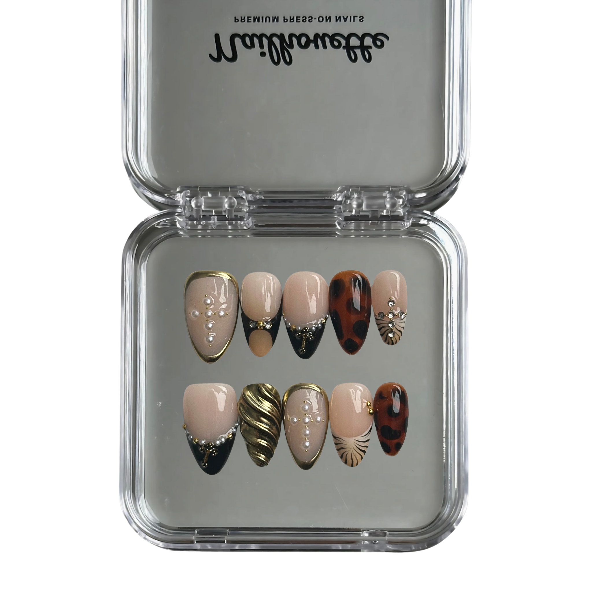 Command attention with THE PRÉCIEUX, a formidable design from our luxurious Ambergris Collection. These press-on nails feature a sophisticated nude beige base, serving as a canvas for a powerful interplay of beige, black, golden, and dark brown hues. Intricate 3D swirl sculpted golden textures add opulent dimension, complemented by striking jewel cross signs, bold cross motifs, and daring leopard print artistry. THE PRÉCIEUX is the epitome of strong, premium style for the modern conqueror.