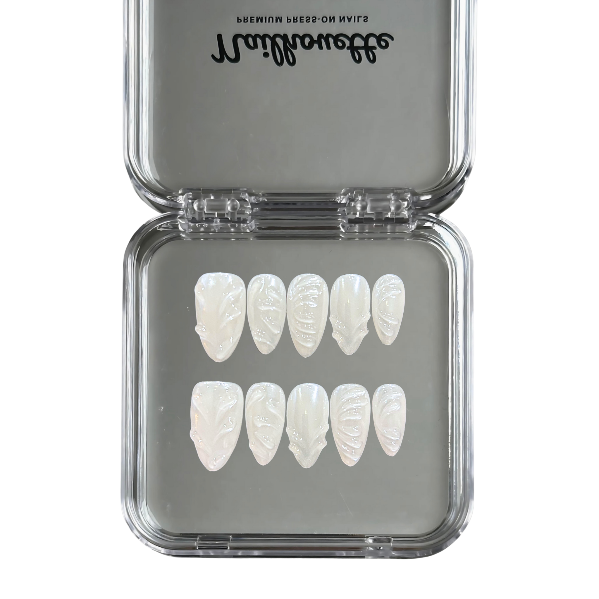 Unveil the enchantment of the night sky with LUNAR LORE, an ethereal addition to our premium Fallen Halo Collection. These press-on nails feature a luminous white pearly base that radiates elegance. The sophisticated 3D swirl textures catch the light with every movement, embodying a celestial dance of luxury and grace.