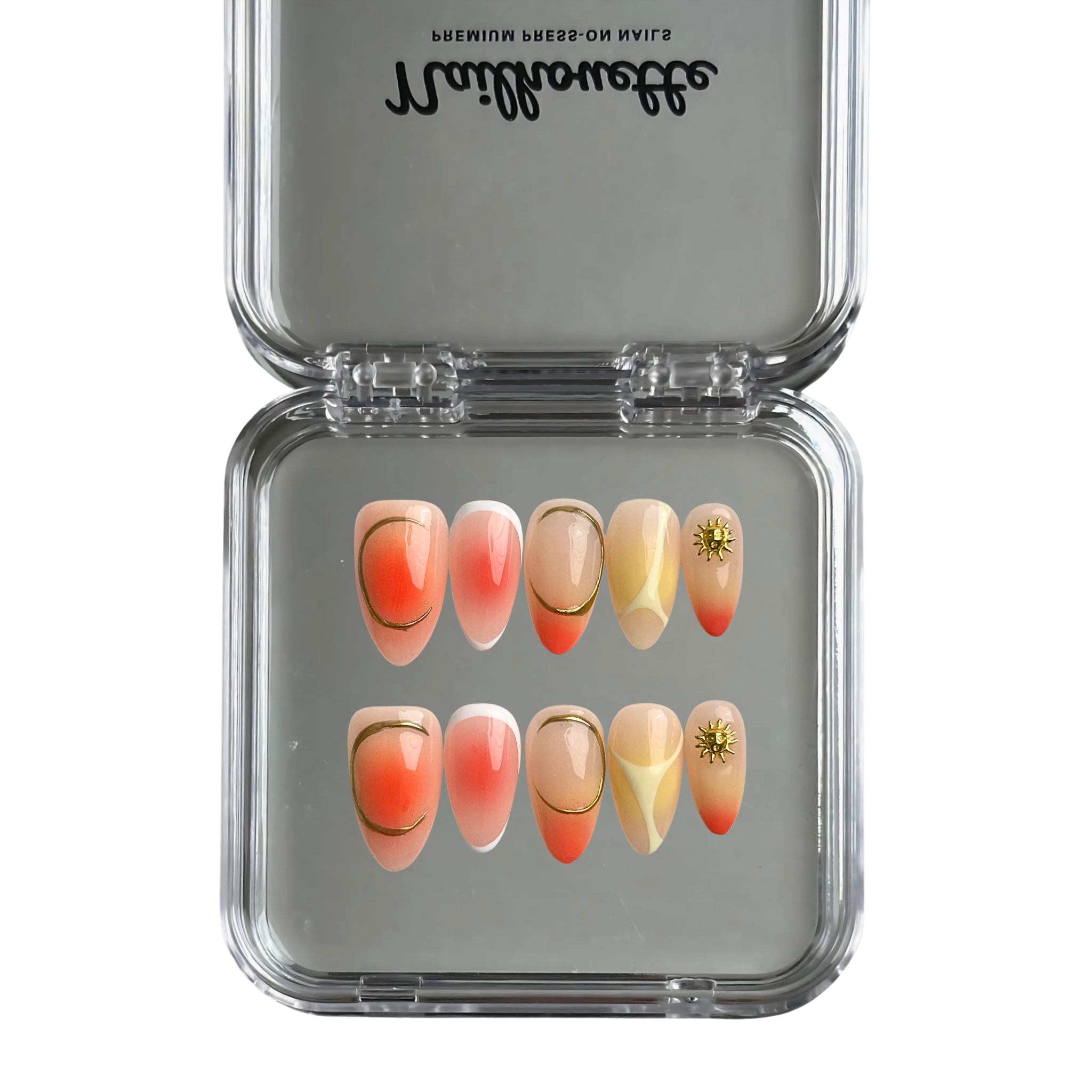 Bask in the serene glow of twilight with GOLDEN HOUR, an exquisitely warm design from our luxurious Ambergris Collection. These press-on nails capture the fleeting magic of a sunset, featuring a rich orange base that melts into a captivating orange-yellow ombre. Adorned with delicate golden sun charms and sophisticated, sun-inspired 3D golden sculpted circles on select nails, GOLDEN HOUR radiates a romantic and comforting warmth.