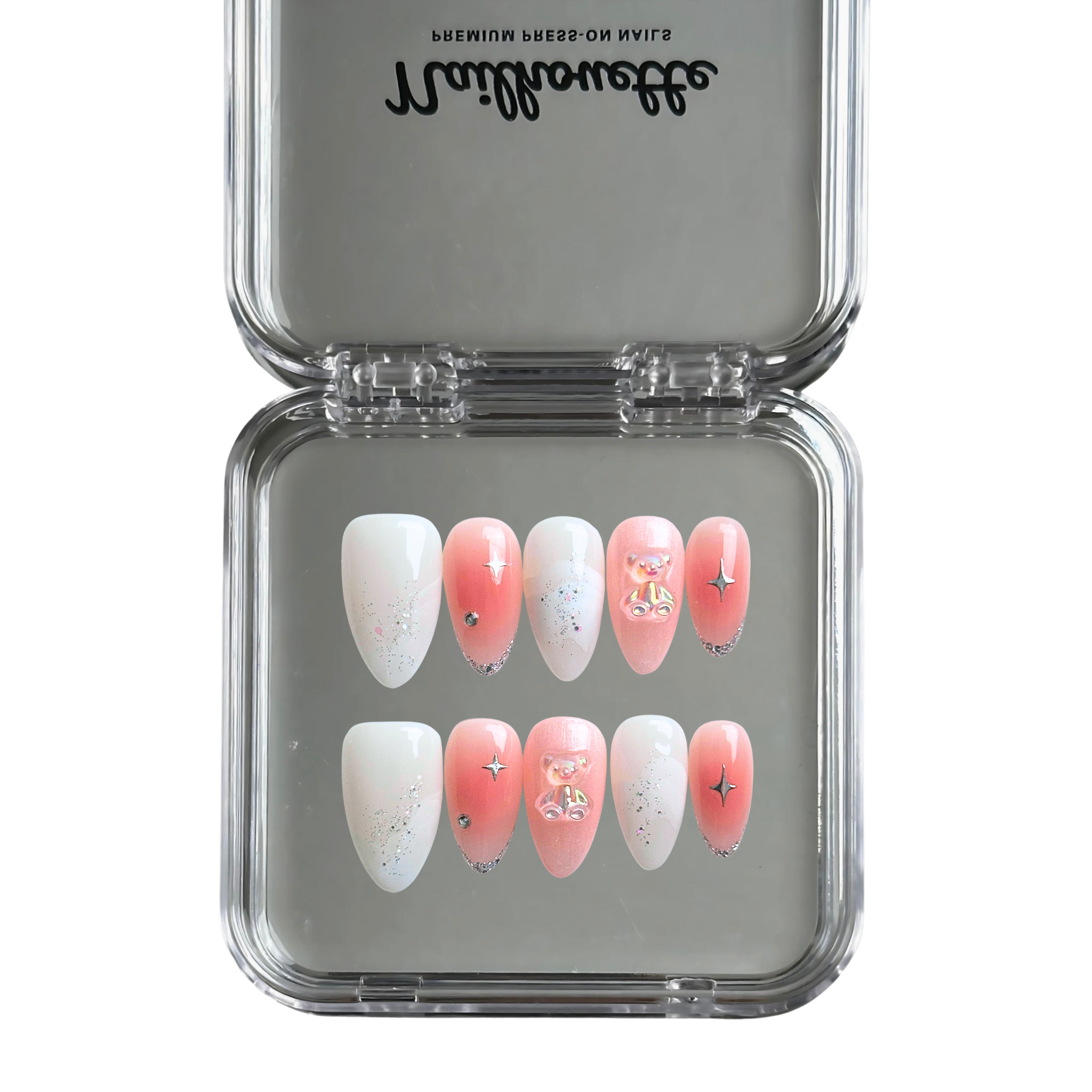 Embrace enchanting whimsy with CHERUB’S TEDDY, a uniquely delightful design from our heartwarming Blushing Burgundy Collection. These press-on nails are a playful yet elegant expression of soft femininity. The base features a dreamy soft blush pink with a subtle ombre effect on select nails, complemented by ethereal white pearl finishes that evoke the softness of clouds. Adorned with adorable 3D transparent teddy bear charms, chic silver chrome line tips, and a magical sprinkle of silver stardust, CHERUB’S TEDDY is where playful innocence meets sophisticated charm.