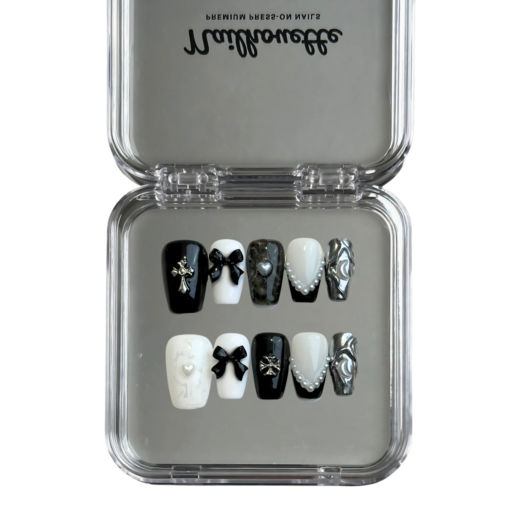 Embrace the essence of gothic romance with BISOU NOIR, a captivating set from our premium Fallen Halo Collection. These bold press-on nails blend the allure of black and white with luxurious silver and celestial moon motifs, creating a statement piece that commands attention. Each nail features a harmony of gothic elements, including 3D charm ribbons, pearl accents, and a striking cross, all set against the backdrop of a midnight canvas.