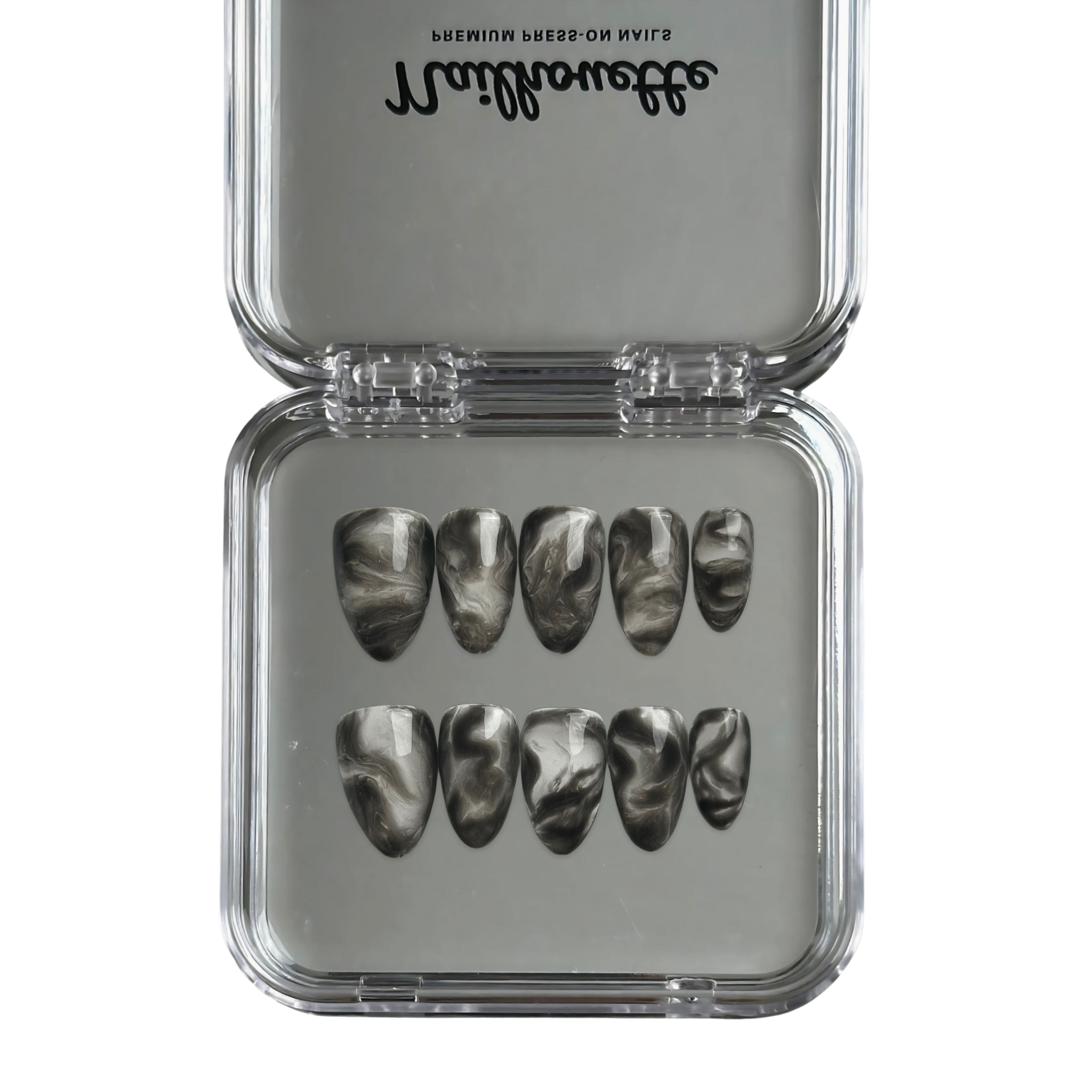 Embrace the allure of the dimming sky with our TWILIGHT TEMPTRESS, a captivating design from our exclusive Fallen Halo Collection. These press-on nails feature a mesmerizing black smokey marble effect that swirls across a transparent base, capturing the elusive beauty of twilight's first stars. The short almond shape offers a modern take on elegance, ensuring these nails are as practical as they are enchanting.