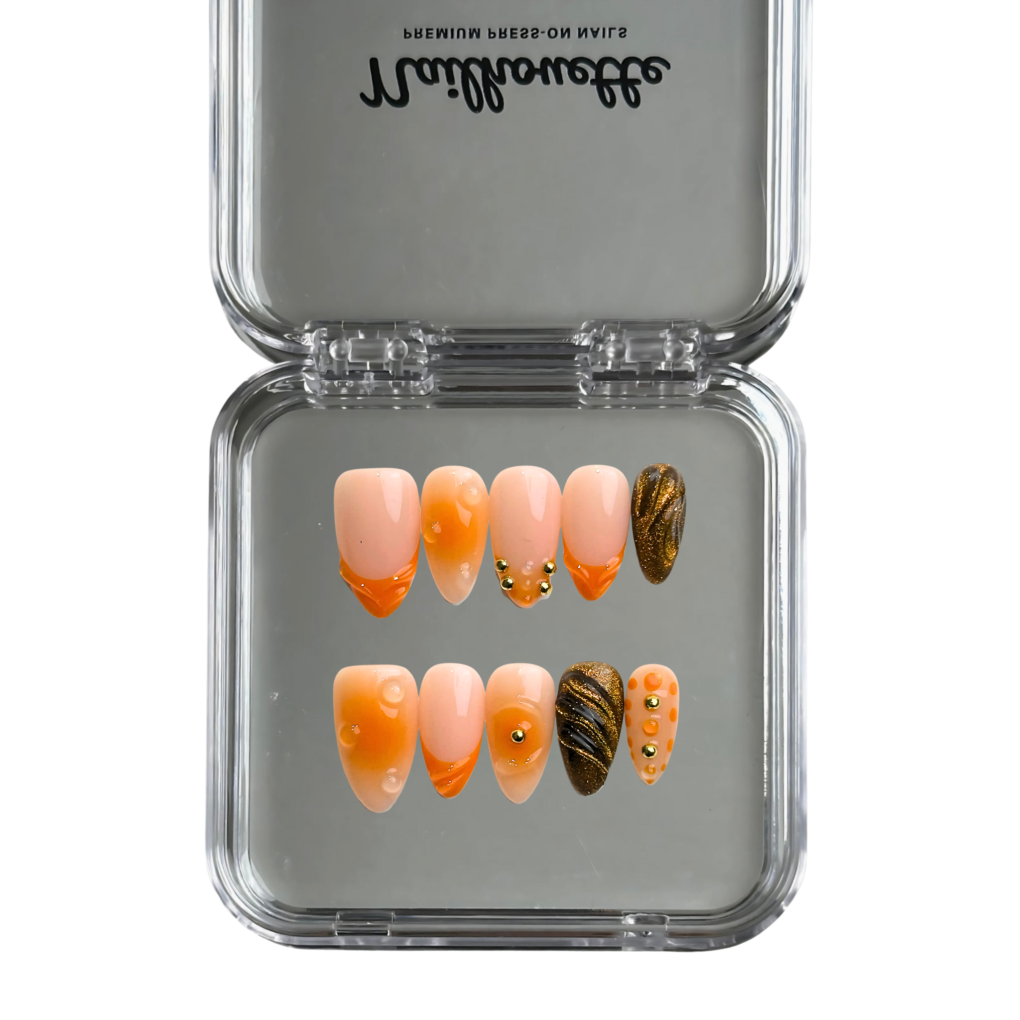 Embark on a journey of vibrant self-expression with THE ODYSSEY, a captivating design from our luxurious Ambergris Collection. These press-on nails feature a warm peachy nude base that flows into a lively orange ombre. The design culminates in bold, bright orange French tips, uniquely adorned with intricate 3D sculpted water-flowing textures and playful bubble accents. THE ODYSSEY is a sophisticated yet joyful statement, crafted to instantly brighten your day.